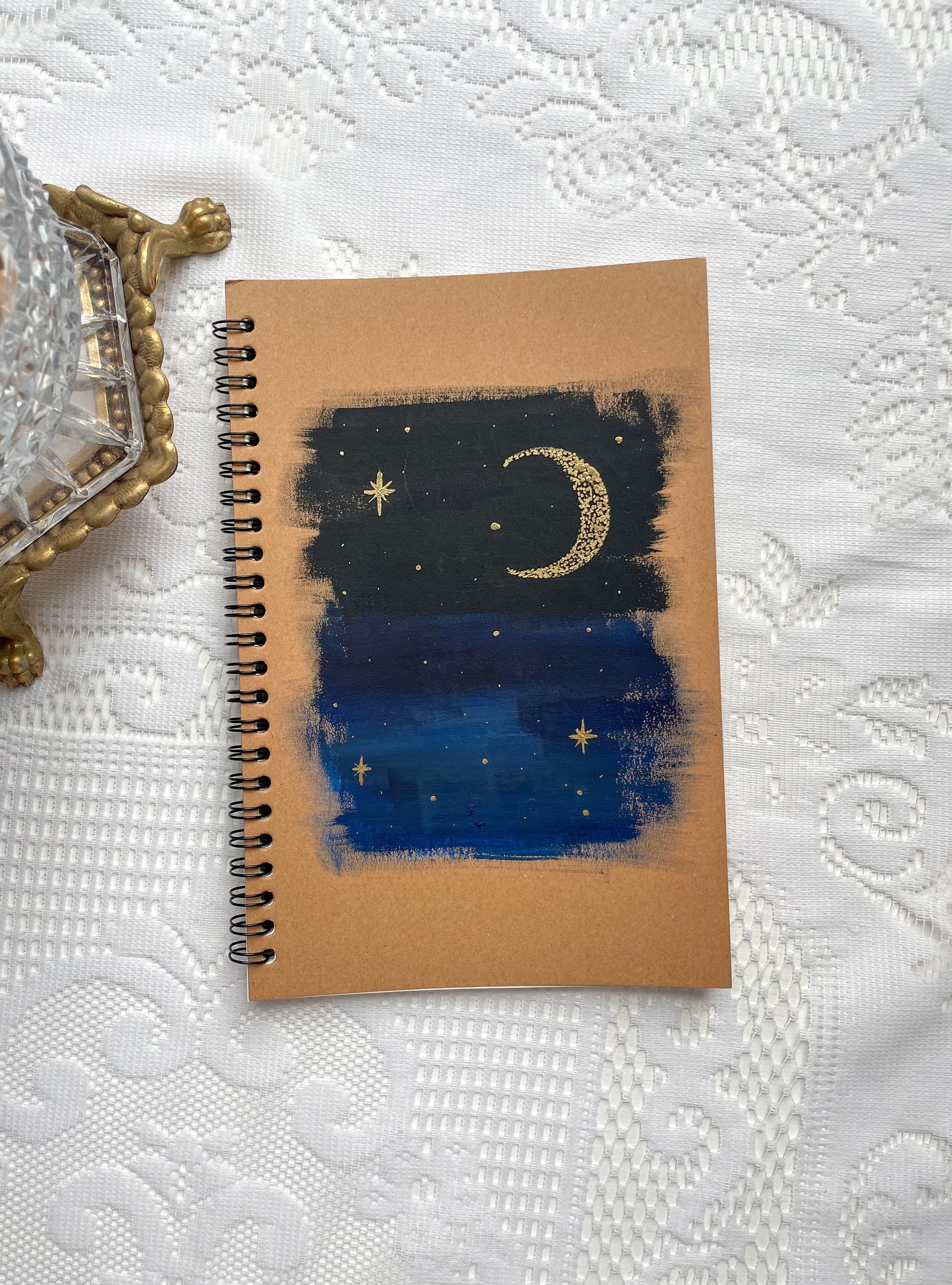 This Hand Painted Moon and Stars Spiral Notebook features spiral binding for easy use. With wide-ruled pages and 50 sheets or 100 pages, it provides ample space for writing. Measuring 8.3 x 5.5 inches, it's compact and convenient for taking notes on-the-go. Perfect for organized and stylish note-taking.